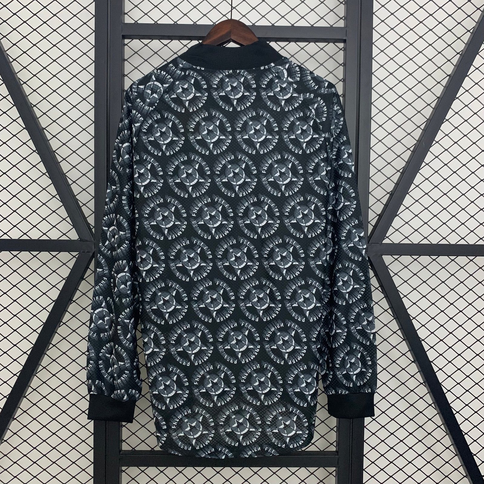 Logos: Besticktes Vereinswappen im Originalstil; Sponsor in Weiß – starker Kontrast zur wilden Grundoptik.