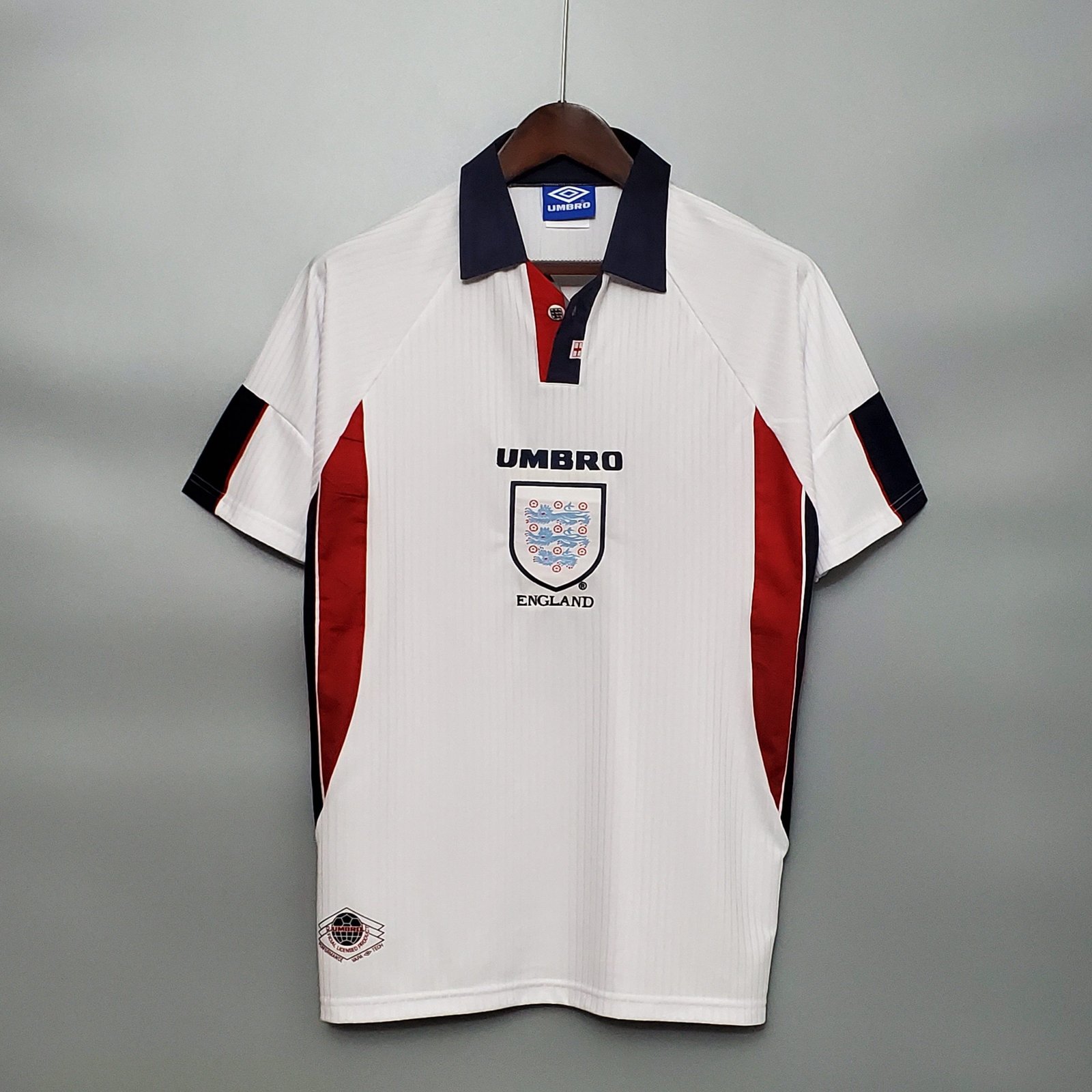 Logos und Drucke: Gesticktes Three Lions-Wappen auf der linken Brust, „France 98“-Abzeichen auf der rechten – eine Hommage an die Weltmeisterschaft.